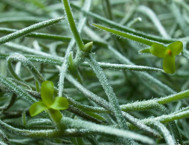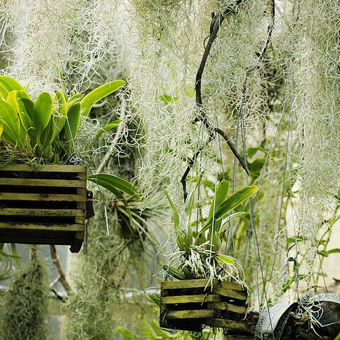 鳳梨科的植物有很多,分成50個屬,共計2600多種,我們熟悉的菠蘿就是鳳梨科的植物。空氣草,又叫空氣鳳梨、松蘿鳳梨、苔花鳳梨、老人須等等,名字很多??諝獠菔区P梨科草本植物,附生在其他植物上。它的莖、枝、葉都是線狀的,葉片上還有很多鱗片。這些鱗片是用來吸收空氣中的水分和養(yǎng)分的,而它們的根主要起固定作用。